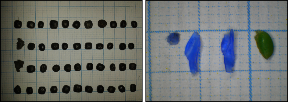 Zur Ermittlung der Menge an Mikroplastik im Fluss wurden bisher 140 von etwa 170 Proben ausgewertet. Zwei Drittel dieser Proben enthielten Mikroplastik. Oft fanden sich nur wenige Bruchstücke größerer Plastikobjekte oder Pellets. Das klingt erst einmal nach nicht sehr viel. Allerdings muss berücksichtigt werden, dass von den Plastikpiraten nur Mikroplastik gefangen werden konnte, das größer als 1 mm ist. Viel Mikroplastik ist jedoch noch kleiner und ging somit durch‘s Netz. Einige wenige Proben enthielten jedoch über 100 Mikroplastikteile, wie z.B. eine Probe aus der Laucha, die zum Flusssystem Elbe gehört. Hier fanden Schülerinnen und Schüler viele Dutzende Pellets, die aus Polypropylen bestehen (was z.B. als Verpackung oder Gehäusehüllen für Elektrogeräte Verwendung findet).